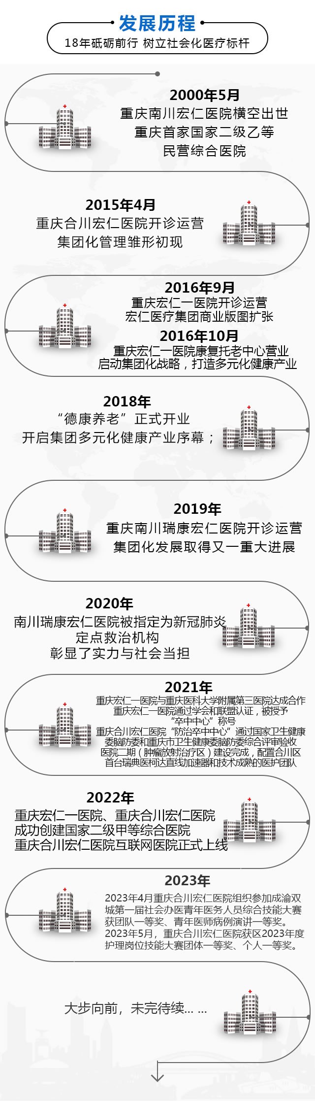 重慶瑞康宏仁醫療,旗下擁有重慶南川宏仁醫院、重慶宏仁一醫院、重慶合川宏仁醫院、德康養老中心、重慶南川瑞康宏仁醫院等多家大型醫療機構,自2000年5月第一家宏仁醫院創辦開業以來,經過近20多年的發展,目前宏仁醫療集團已經成為重慶乃至西南地區大型的民營醫療集團之一。